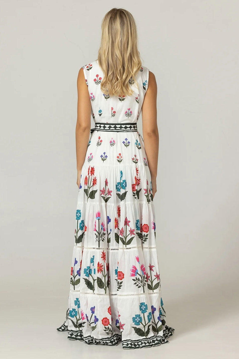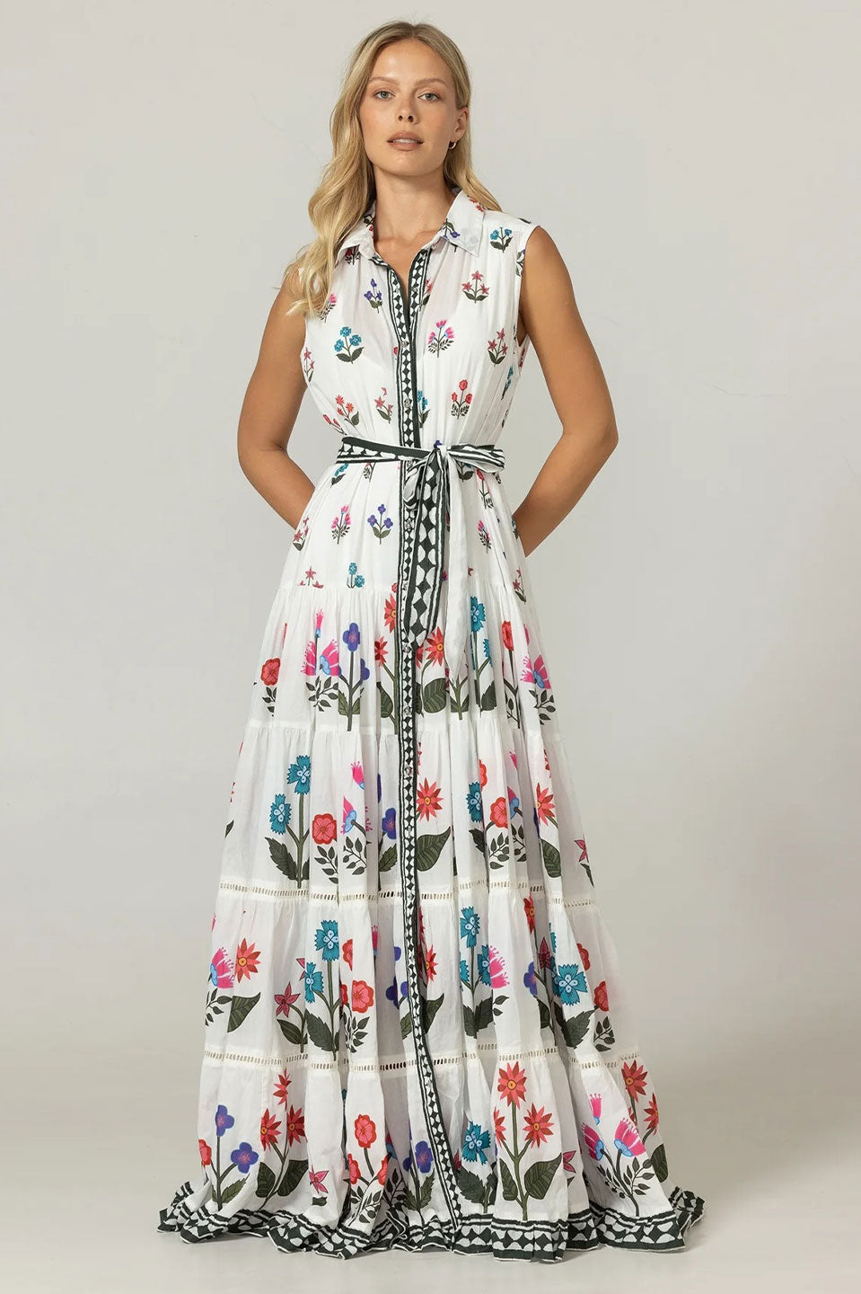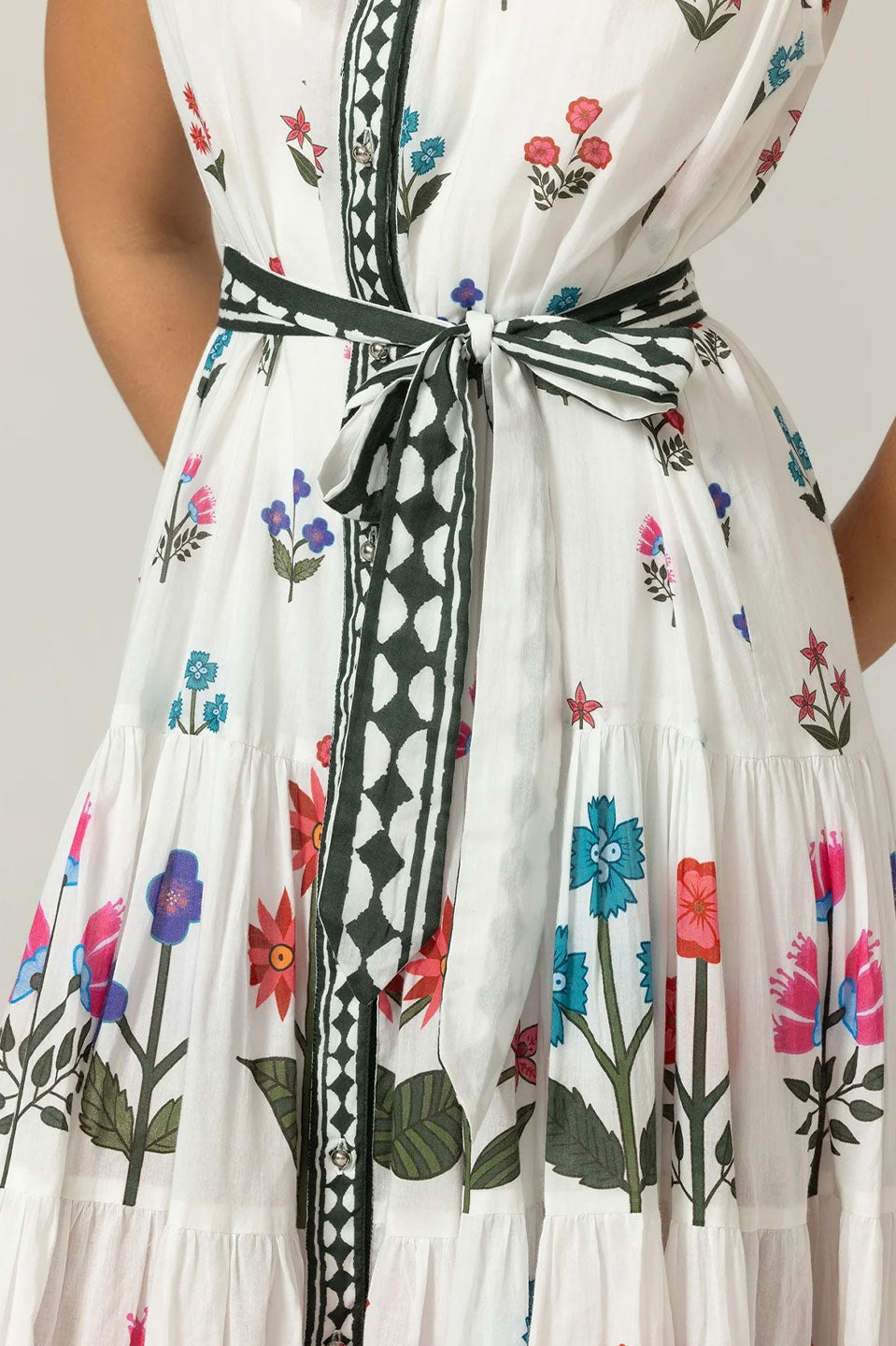 Γυναικείο φόρεμα με κεντήματα και ζώνη λευκό-εμπριμέ Miss June