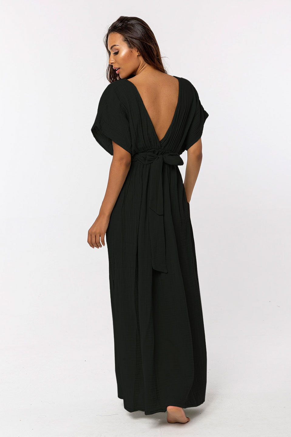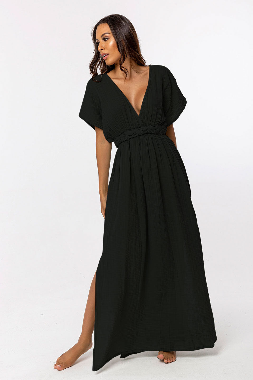 Γυναικείο φόρεμα αέρινο γάζα μαύρο με σκίσιμο και ζώνη Blanca