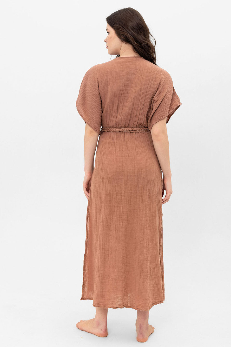 Γυναικείο φόρεμα γάζα με ζώνη καφέ Blanca