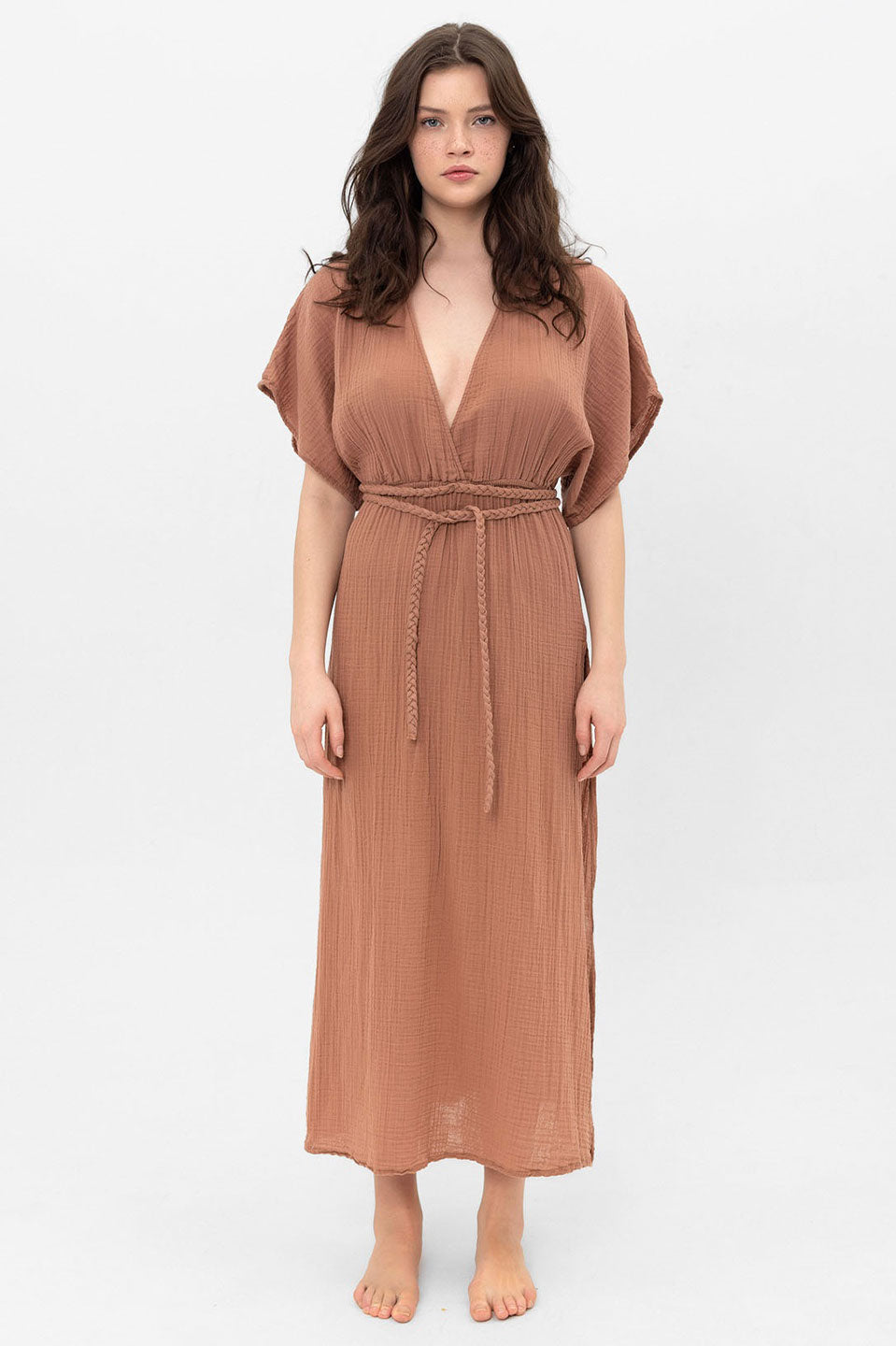 Γυναικείο φόρεμα γάζα με ζώνη καφέ Blanca
